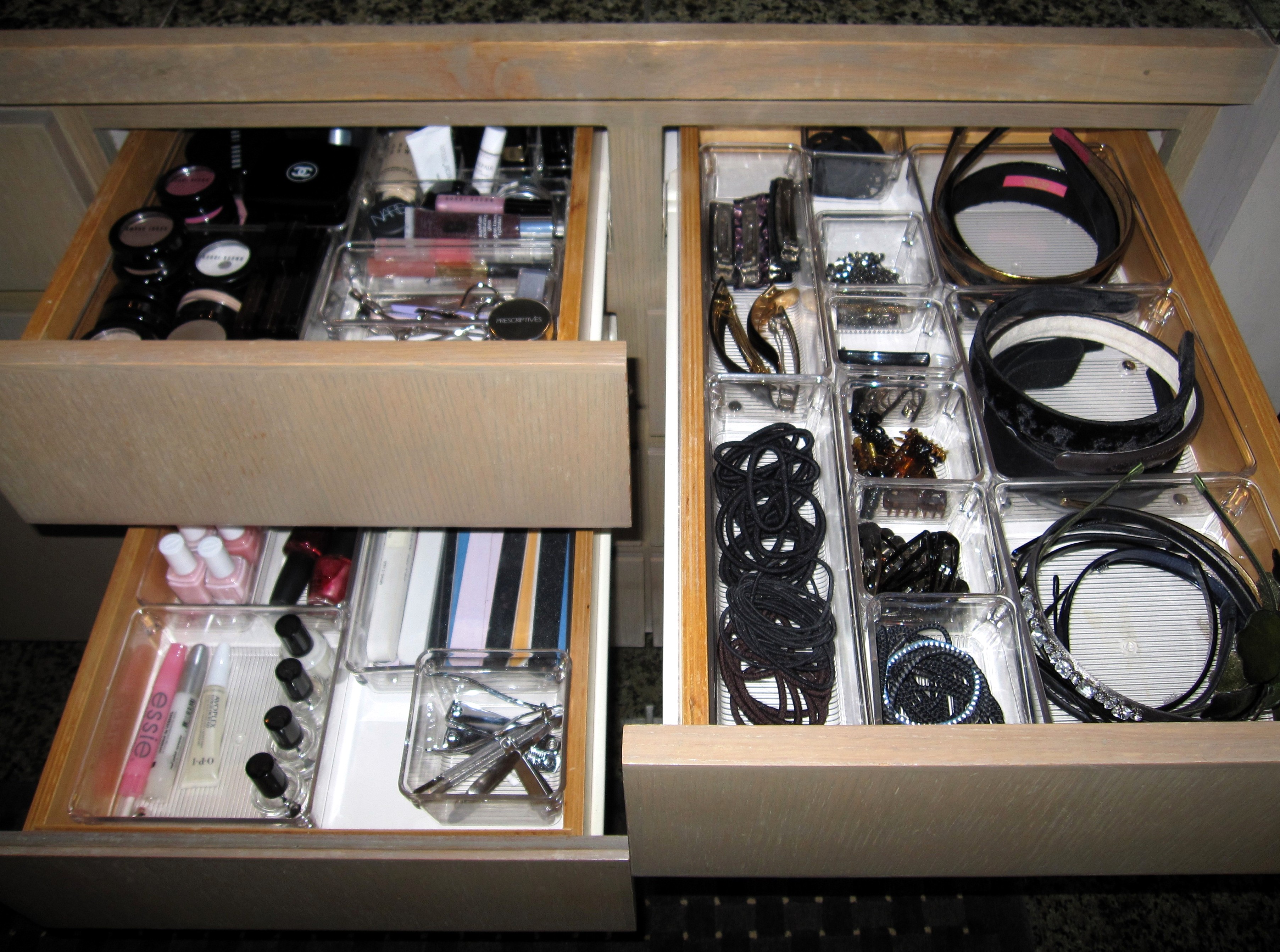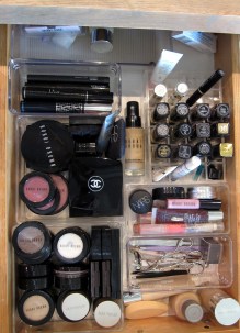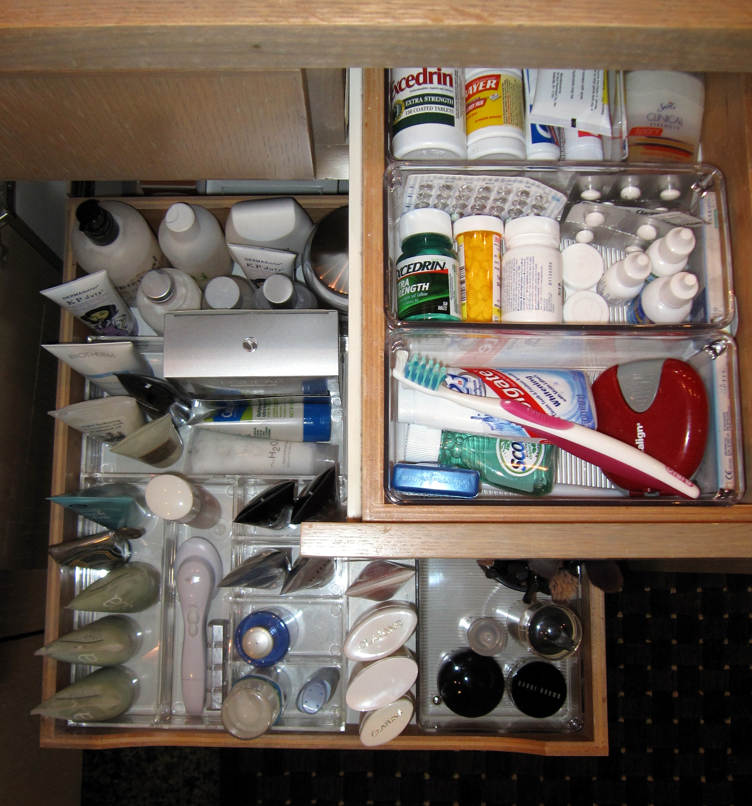 After living in our house for 10 years I can no longer take the chaos residing in our drawers, cupboards, cabinets and closets. Been slowly tackling them room by room. Recently, it was the dreaded bathroom, or in other words, the place where cosmetics go to hide; never to be seen again. Had had enough of losing things, bottles of medicine rolling around, searching and searching for the right hair accessory. Now, most people would have organized their drawers right when they moved in…I’m a slow learner. But after seeing these little boxes at my friend Heidi’s house a while ago I knew they would be my savior. Finally figured out what I needed, made a list and headed to The Container Store. Our bathroom drawers are incredibly deep so these Linus Drawer Organizers were the perfect solution to bring the pandemonium into control. I used a mix of deep and shallow modular containers, depending on what they would be holding. Ranging from $2.99 to $6.99 each, they are an investment but with rubber feet to prevent sliding and made of clear, hard plastic they’ll last a long time. And yes, I organized Farb’s drawers as well.