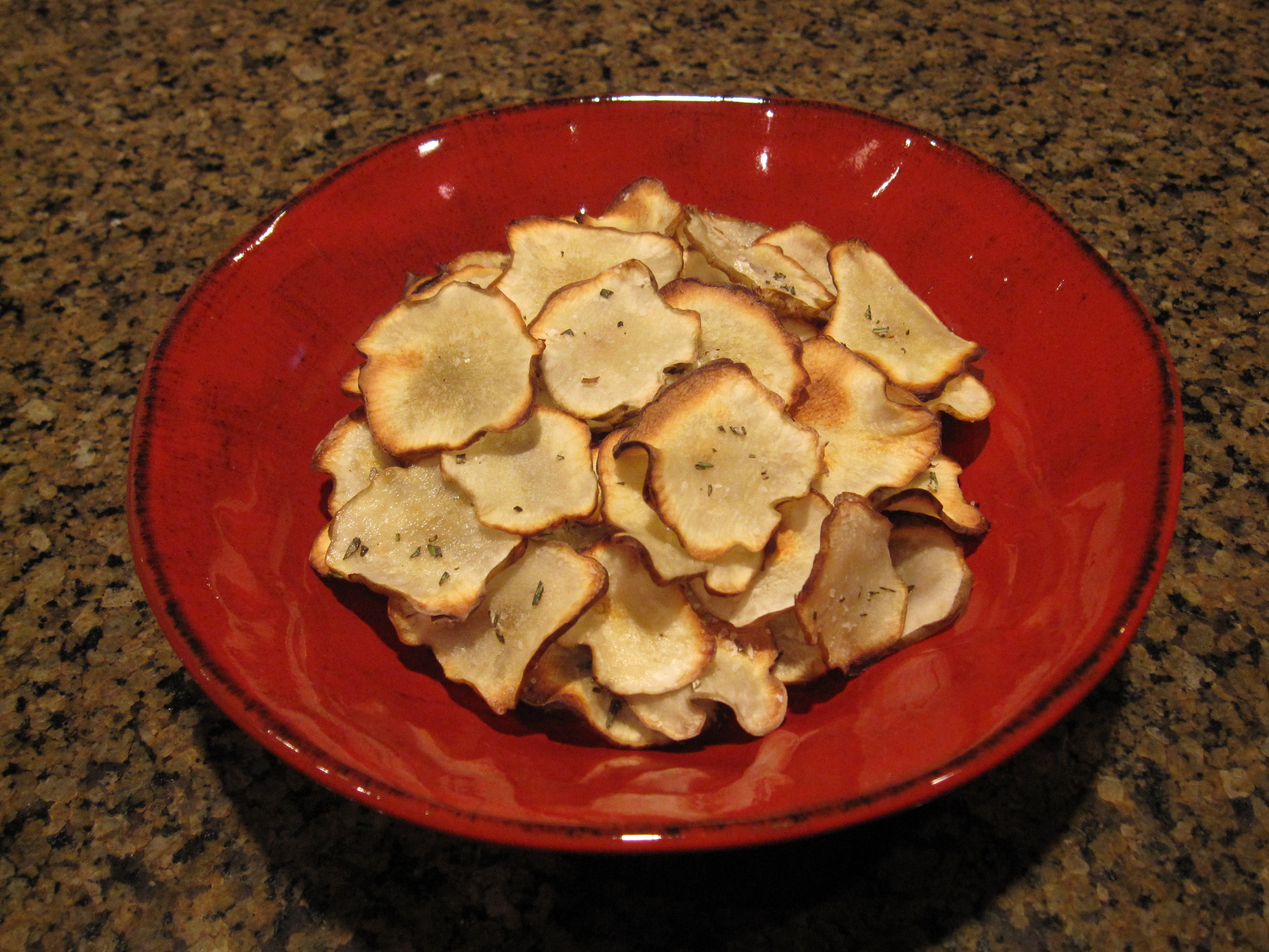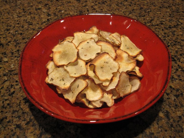 Fill a bowl with cold water. Using a mandoline, slice the sunchokes into 1/16″ slices, quickly dropping them into the water to avoid browning. Combine salt + rosemary; set aside. Heat oven to 400°. If you have a dual oven, do not use the convection feature. Working in batches, remove the sunchoke slices, patting them dry and laying them on a roasting tray in a single layer. Brush the tops with a little oil and roast for 15 minutes or until crispy. Remove from oven and while still hot, sprinkle with rosemary salt.