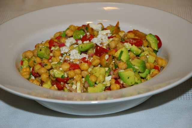 What a soggy, grey Seattle day. An icky sick day at that. As I was sitting at the kitchen counter eating, what else, chicken soup, I noticed the avocados I bought recently needed to be used. Decided to make a salad based on a great dish we had last time we visited Goldfarb’s dad and Janice in Arizona. She had made this wonderfully simple salad of chick peas, tomatoes and avocados. This is my take on that dish – in which I was able to use all my avocados, lemons and a couple of vegetable remnants. So easy, so tasty…I just wish it also came with the Arizona sun.