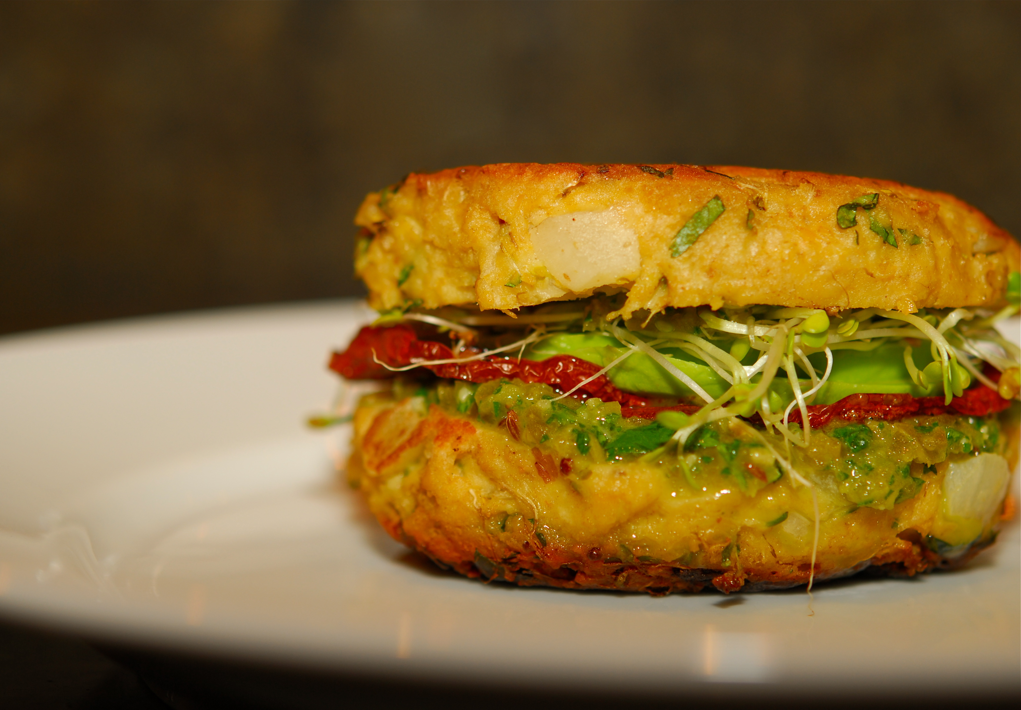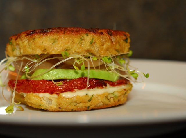I’ve got to say: Heidi Swanson is a genius.  She has a great knack for transforming ingredients into delicious meals.  And her idea to turn the patty into the bun for this recipe? Perfect!  There is so much flavor in the patties and they hold together so well; pick em up and dive in.  Recipe calls for mini burgers; I made regular sized ones.  For that size, recipe easily makes four. Created our own fillers to make two different burgers. Burger 1: aioli sauce, pickled onions, roasted tomatoes, avocado and sprouts {Goldfarb’s fav}.  The roasted tomatoes really stood out well against the sauce and onions.  Burger 2: roasted tomatoes, avocado, sprouts and schug – an incredibly delicious Jewish sauce I read about in this month’s Saveur.  And it is so easy to make:  combine 8 oz jalapeños [I used canned in escabeche which gave the sauce a nice acid hint], 2 cups cilantro, 5 tbsp canola oil, 5 tbsp water, 1 tsp caraway seeds, 6 cloves chopped garlic, 4 cardamom pods – seeds only and season with salt to taste – makes 2 cups.  Puree everything in a food processor until smooth. So simple but full of great flavor! This burger was my favorite – I almost always choose the option that has a little kick.  Try your own combinations with flavors you love. Experimenting was part of the fun.