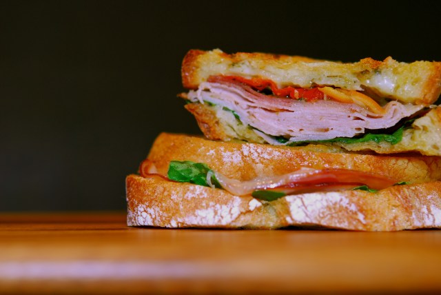 I love this sandwich! And so does Goldfarb. We like it so much I make it quite often. Most of the ingredients I keep on hand in the fridge as ‘staples’ so usually it’s just the cheese, turkey and bread that needs to get purchased. Smothered between two slices of ciabatta bread are a slathering of pesto, two thin slices of provolone, three – four slices of super thin {almost shaved} roasted turkey breast, two slices of proscuitto, sprinkling of Mama Lil’s peppers {unless you’re like me and love these little gems…then the sprinkling becomes a heap} and fresh arugula. I love the hint of saltiness you get from the proscuitto and the kick of the sweet and spicy peppers. I get the turkey sliced pretty thin because it heats through faster. I kept finding myself either burning the bread because it was taking so long to heat or it was cold in the middle with prepackaged turkey’s normal thickness. Slide this into a panini press and cook on med-low heat for 4 minutes or until heated through. You actually don’t need a press to make this – just put the sandwich into a skillet and place a heavy pot on top, flipping the sandwich half way through the cooking process. See? No special equipment required. Let the sandwich rest for a minute or two before cutting it in half. If you’re not careful this sandwich can get expensive so unless you’re going to eat it for several days in a row {which I do a lot} or are feeding a big group, buy the meats and cheese {which also allows you to control the thickness of both} from the deli counter so you just get what you need. Many stores have an olive bar now, too, where you can get small amounts of pesto and peppers. Give this sandwich a try. I think you’ll love it as much as I do.