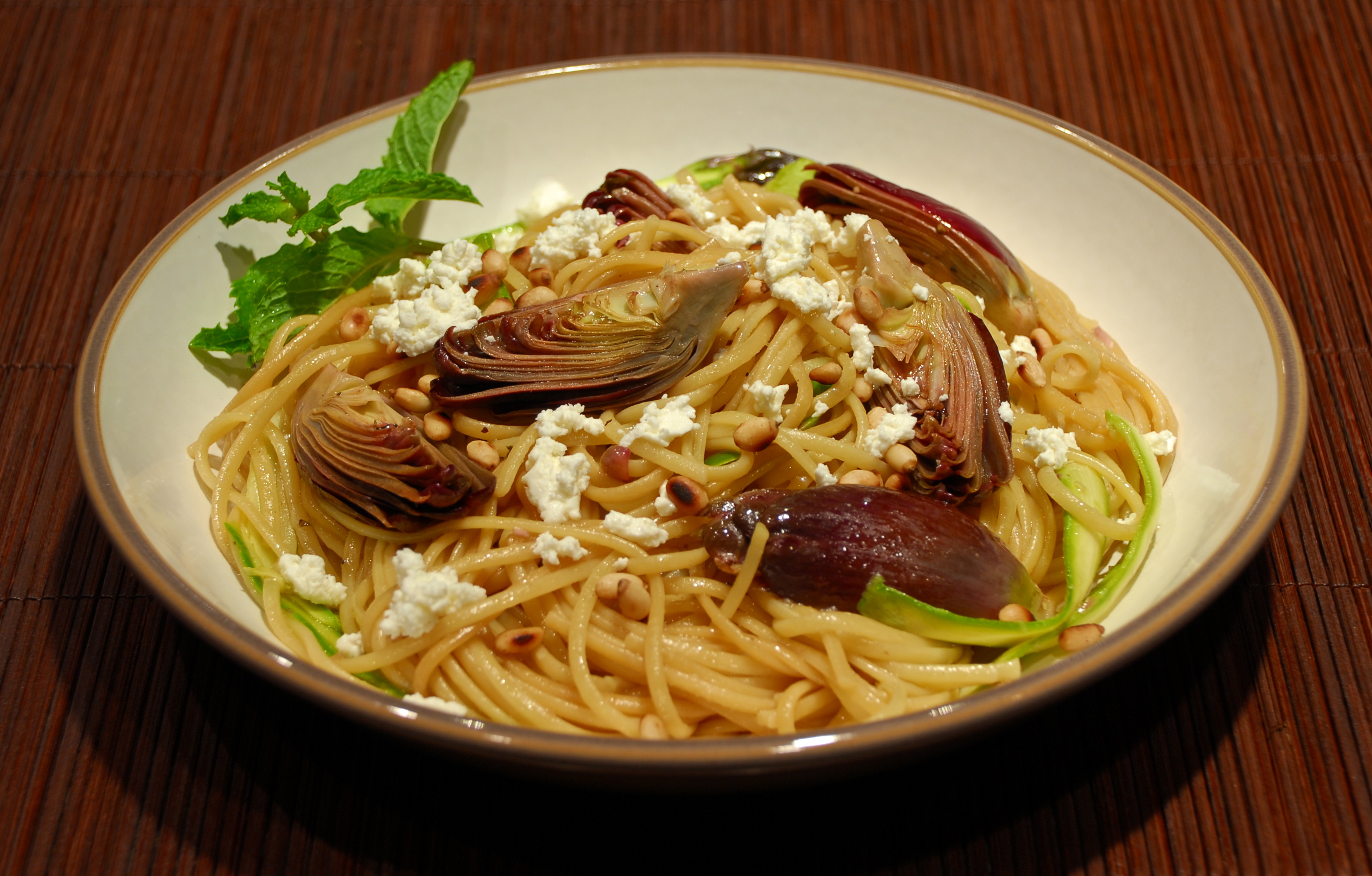 Last weekend Goldfarb and I were invited to dinner at the home of some friends where the lovely Renee Erickson of Boat Street Cafe was doing a cooking demonstration followed by a wonderful spring meal.  I’ve been in love with Boat Street since I moved to Seattle – when original owner Susan Kaplan set up shop on north Lake Union. When I first joined JDRF, our office was located about a mile and half from the restaurant and every opportunity to have lunch there was such a treat.  After doing an apprenticeship at Boat Street and traveling abroad to learn more about food, Renee returned to Seattle and took over ownership of the restaurant.  Repeatedly named one of the city’s top restaurants, Boat Street Cafe, now located in the regrade, is one of our favorite places to share a great dinner with friends.  There were so many delicious things from last Saturday’s dinner but one thing that stood out were the artichokes  – carciofi alla romana.  I loved the herbacious sauce so much that I decided to take the recipe and tweak it a little to turn it into a pasta dish.  It is easy to make and utilizes fresh spring produce. Asparagus and artichokes are probably two of the hardest vegetables to pair with wine, but with a little help from the people at Pike and Western Wine Shop, the  Grüner Veltliner {09 Gobelsburger Kamptal, Austria} – worked out perfectly.  This affordable white wine is easy to drink, has the slight aroma of vegetables and light taste of peaches.  It’s the wine I used in the sauce and what we had with dinner.