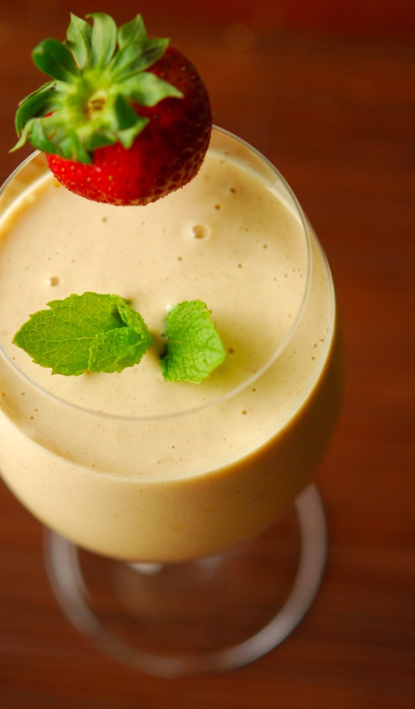 In a blender combine all ingredients except strawberries and mint. I used frozen mangoes because that is what I had on hand – if you use fresh, add 1 cup of ice.  Pulse until smooth.  Pour into four glasses and garnish with strawberries and mint.