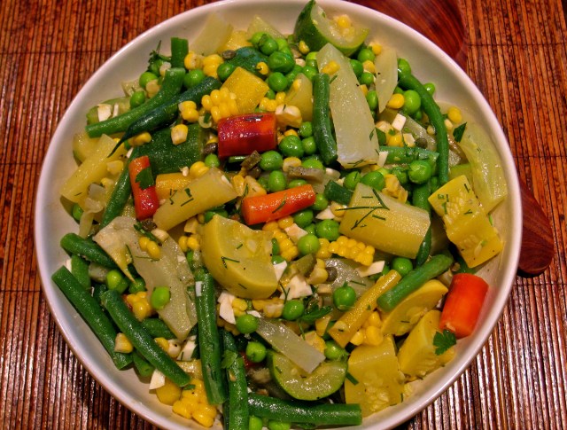 Bring a pot of water to a boil. Add a tsp. of Kosher salt. Woking in batches, blanch all the vegetables – cook for 3-4 minutes until just tender, immediately remove from the boiling water and put into an ice bath. Once cooled, remove from ice water and let dry a top of paper towels or a lint-free kitchen towel. Slice corn kernels off the cob and add it with the other vegetables to a large bowl. The corn and peas, beans and carrots, fennel and squashes can be cooked together.