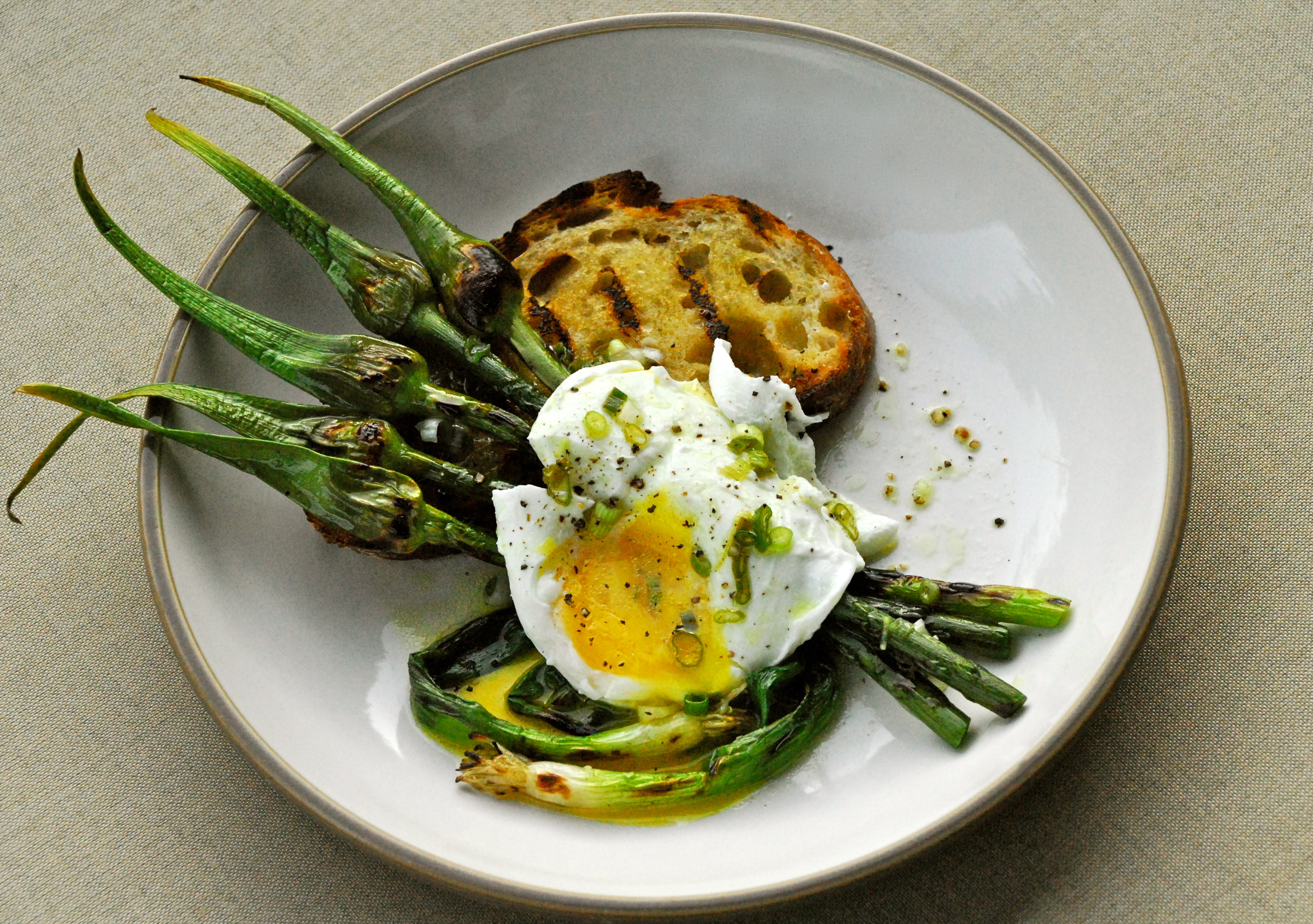 So here we are…halfway through the year with our Meatless Monday endeavor {and okay, it’s a Tuesday – MM was on hold for the 4th}. It has been easier and more delicious than I’d imagined. And since there has only been one thing Goldfarb hasn’t loved {the ricotta gnudi – he has an issue with little mounds of dough}, I’d say all has gone well so far. After yesterday’s flank steak gut bomb {I think I had three servings}, we were craving something pretty light today. The beautiful warm weather sealed the deal. And coupled with the fact I spent the second half of the day in the hot afternoon sun cleaning the deck and outdoor furniture, I also needed something really fast to make. This recipe fit the bill on all fronts. Utilizing fresh garlic spears {If you haven’t tired these before you should! Texture of an asparagus, flavor of an artichoke, they can be simply grilled, roasted or sauteed and seasoned with salt + pepper} from the farmers market, this is a nice refreshing meal that comes together in about 20 minutes. Goldfarb was so nice to grill the spears, scallions and bread for me while I poached the eggs…so that helped! Together with a cold, crisp glass of Grüner Veltliner, it’s a nice, flavorful summer dinner.