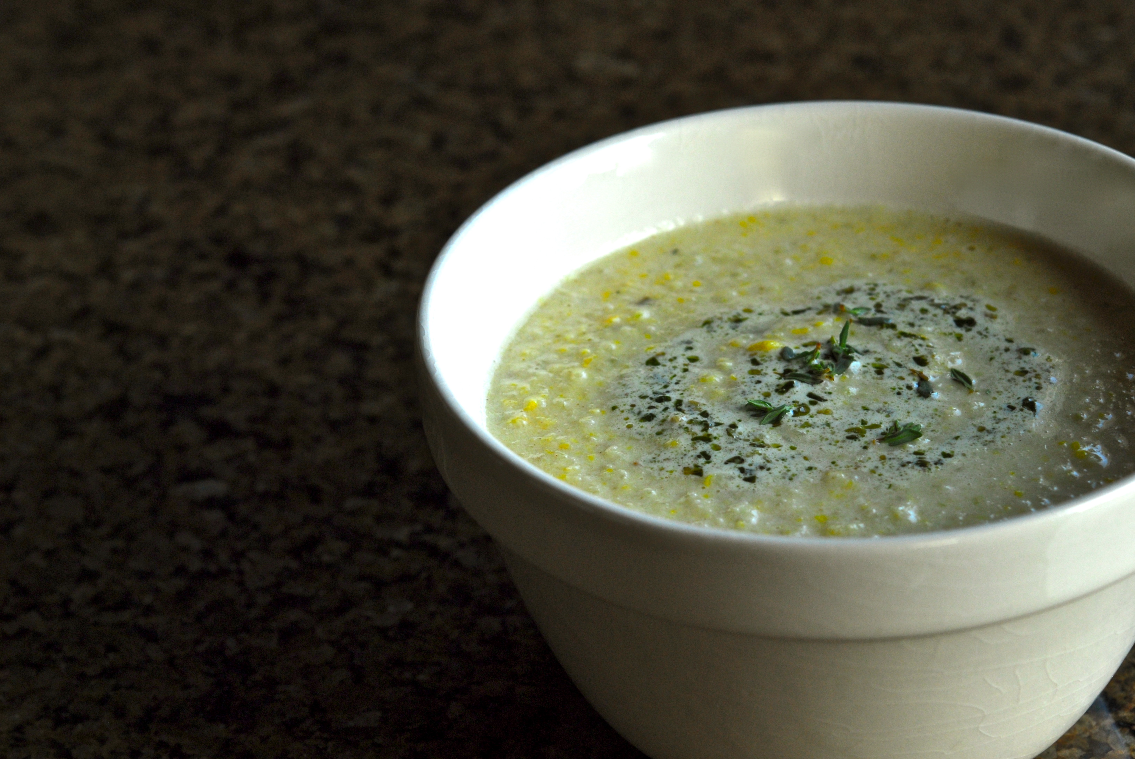 While some people celebrate summer by getting their absolute fill of  stone fruits nothing says summer to me than three seasonal things: zucchini, heirloom tomatoes {especially black krims – so dark red and green they are sometime almost purple} and corn!  This is the 27th meatless monday recipe I’ve posted. And I have to say, if you haven’t tried any of the others yet you definitely should make this.  Corn is at it’s peak so this soup is so lovely and sweet – you’re kids will love it, too!  I left the soup a little chunky, pureeing half of it until fine in a food processor and roughly pulsing the other half.  I wanted to have some texture and am serving this warm.  If you wanted to serve this soup chilled, it would be so nice as a starter…just puree the whole batch until silky smooth.
