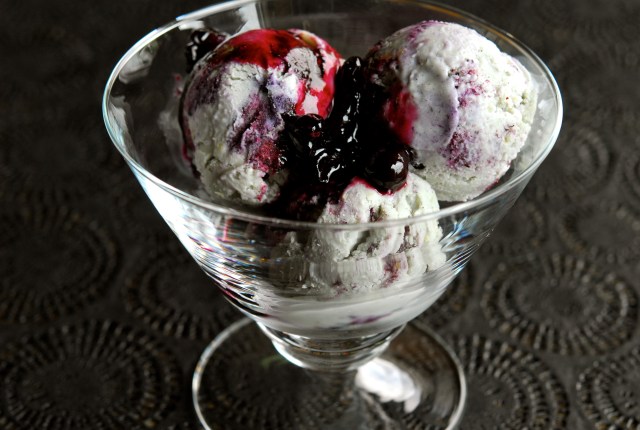 Remove bowl of custard from fridge and pour into an ice cream maker and process according to the manufacturer’s directions. We let the mixture churn for 15 minutes.  Using a slotted spoon, add ¾ of the blueberry sauce.  {Reserve the rest of the blueberries and sauce to pour over the finished ice cream.} Churn for 1 minute.  Turn machine off and spoon ice cream into an air tight container and freeze for 2 hours before enjoying.