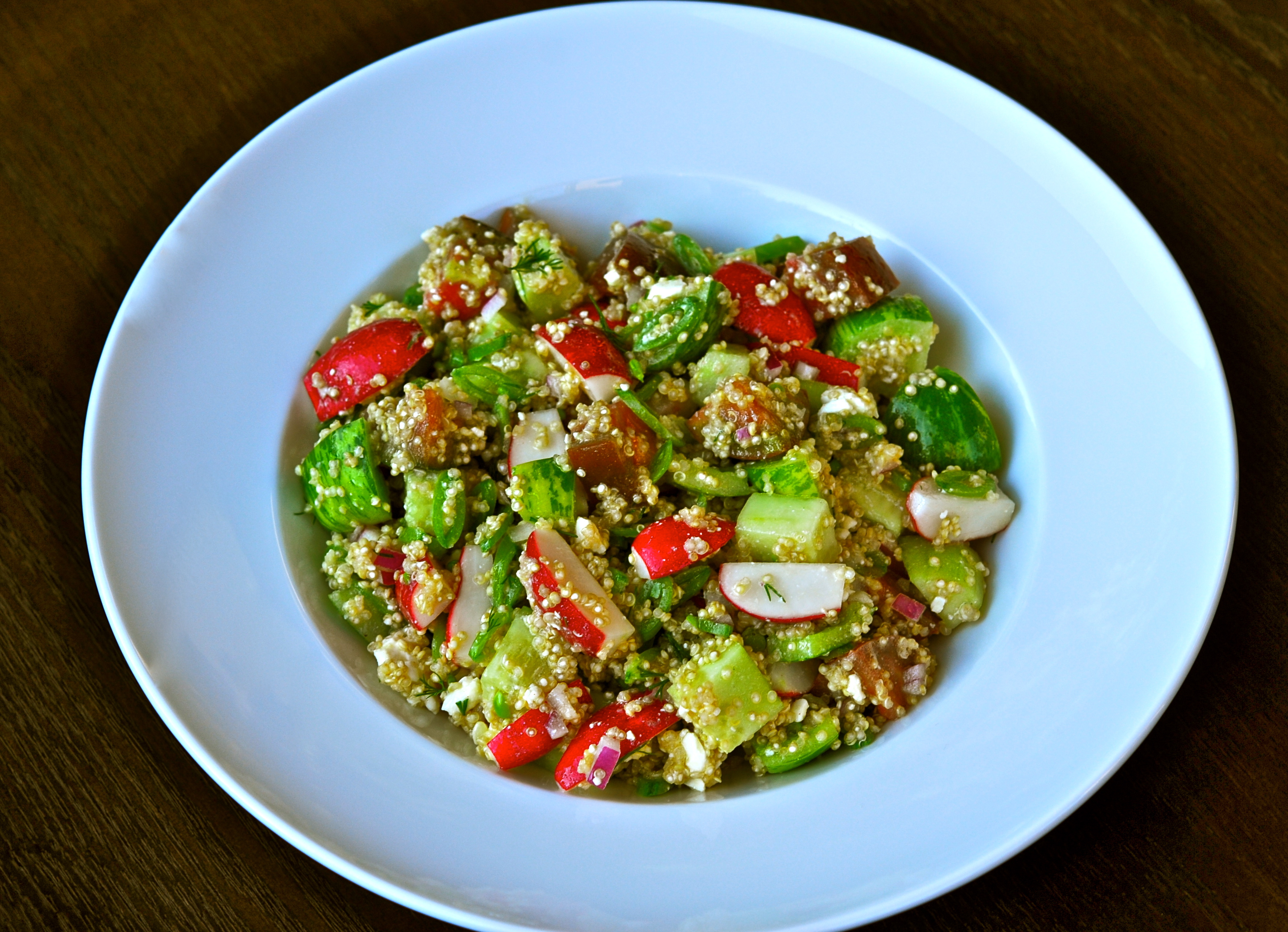After my training session this morning at the gym, I stayed to have lunch with my friends Jenny and Kirsten, who had also just finished workouts. I was excited to sit down and chat with them and also to try a salad from the new line of prepared foods the gym just started carrying. Organic, fresh, healthy and yummy-looking from a company called Molly’s Organics. Sat down to eat my ‘Greens and Beans’ salad with dill dressing only to be disappointed. The green beans were a little worse for wear and the lettuce, wow. There were some huge honking pieces. When the lettuce is as long as your head that is never a good thing. I was the lucky one to be facing the mirror over lunch and as I watched myself eat I thought these three things, in order: 1] I look like a freaking goat with lettuce and curly greens hanging out of my mouth in all directions, 2] I’m so glad I’m eating with good friends and not at a business lunch or date night and, 3] this Molly is a little sloppy. I’d say I just got the short stick but Kirsten’s salad was worse. I think she had some dandelions growing in there. Oh well, on the bright side, Jenny’s sandwich rocked. The orzo salad that was on the menu got me thinking of what we would have for dinner tonight. After some brief discussion the ladies inspired me to make a quinoa salad and I was intrigued with the dill vinaigrette on my salad so decided to make a version of that. The original dressing was good but needed more depth. That depth was dijon mustard. The result? A quick, easy, inexpensive salad that was really flavorful. A little bread, soft cheese, this salad and you’ve got a full meal. For a meal with a protein this salad would be great as a side for simply grilled salmon or chicken. Also, it would be excellent with avocado slices. I went to add it but was so disappointed when I cut mine open and it was rotten. So, so sad. If you add avocado, cut it into slices or 1″ cubes and gently toss in a couple tablespoons of lemon juice then add to the salad right before serving. Trust me, the avocado would be awesome!