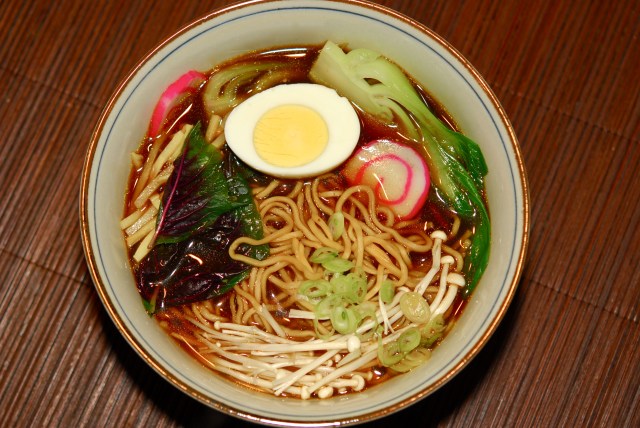Cook noodles as directed on packaging. Once cooked, evenly divide between four bowls. Top each bowl with the hot broth. Now for the creative part: add your choice of toppings to your soup. To each bowl we added thin slices of store-bought fish cake, sprinkling of bamboo shoots, enoki mushrooms, baby spinach, bok choy and a hard boiled egg. Top with the remaining thinly sliced scallions.