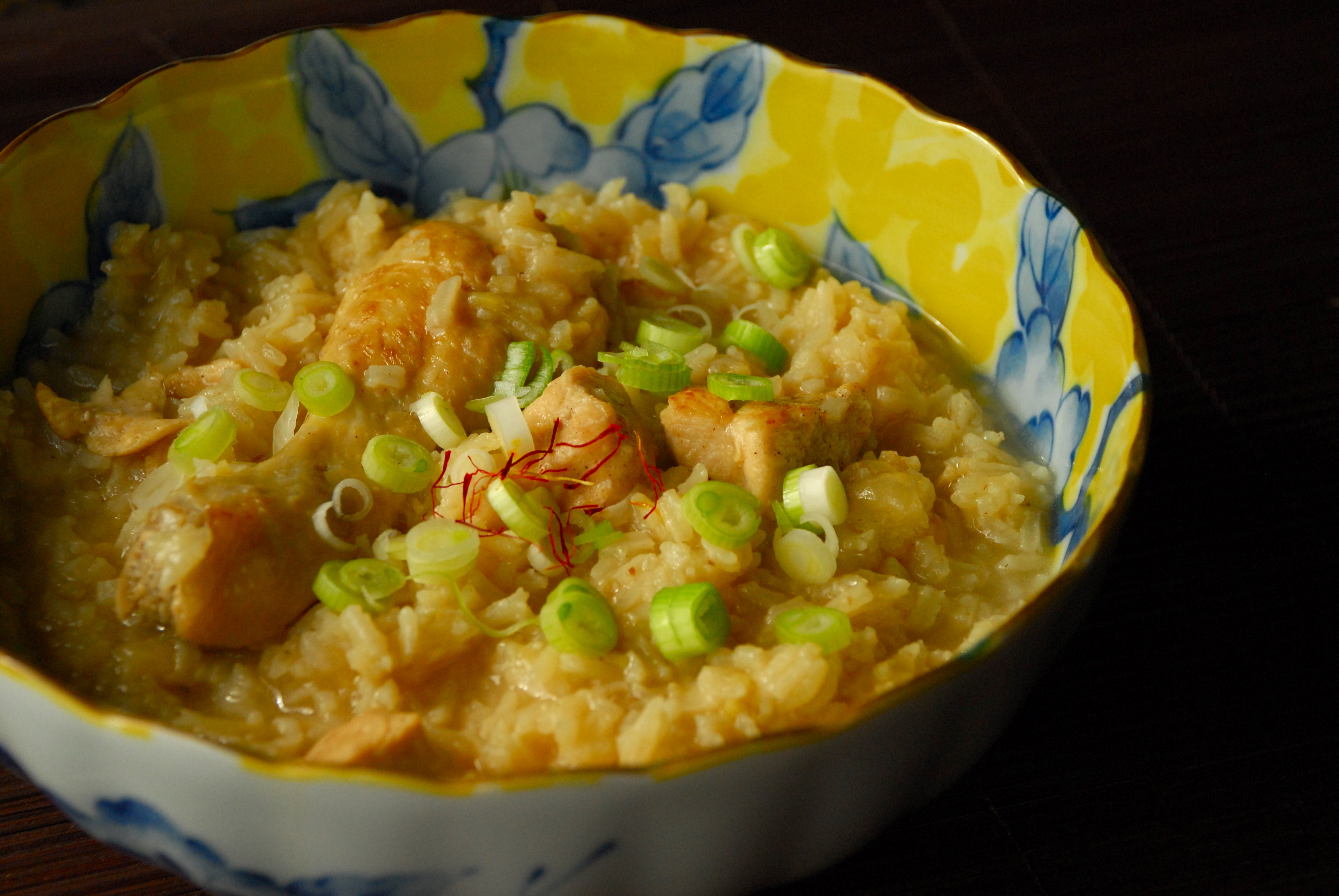 In a large pot with a thick bottom, sauté the onion over medium heat until they are translucent, not browned; about 2-3 minutes. Add garlic, ginger, 4 scallions and saffron. Stir and cook until aromatic; about 2 more minutes. While this is cooking, salt and pepper the chicken. Remove onion mixture from pot. Raise heat to medium high and brown chicken, 2 minutes per side. Return onion mixture back to the pot and add chicken stock, raise heat to high and bring to a boil. Once a boil is reached, reduce heat, cover and let chicken cook for 15 minutes over a low simmer. Add rice, stir, cover and cook for 20 minutes. Taste stew and if you would like more salt, add fish sauce to taste. Divide between bowls and sprinkle remaining scallion slices on top.