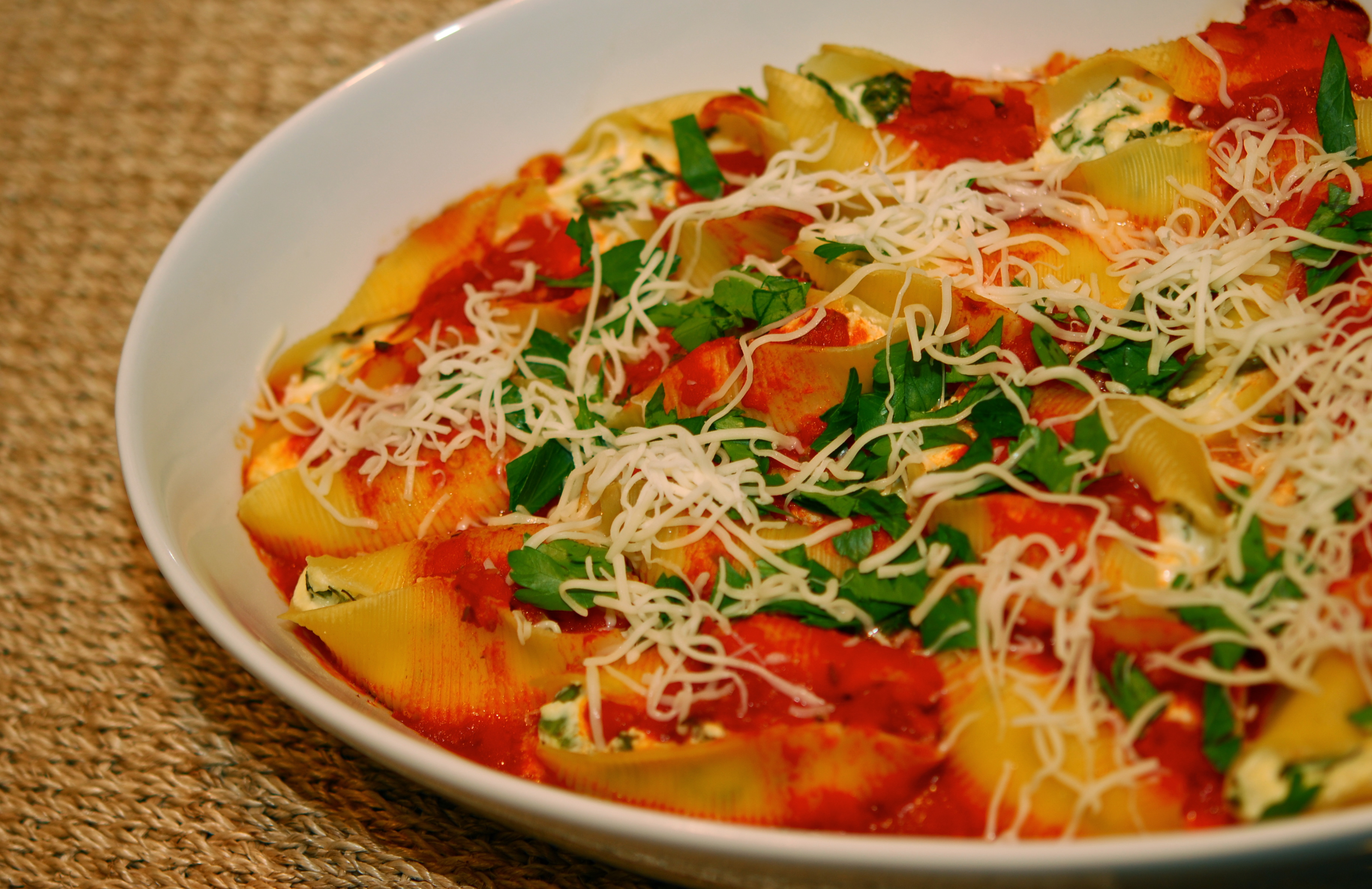 Use remaining 1 tbsp. of olive oil to grease a 9″ x 13″ baking dish. Add 1/3 of the marinara sauce to coat the bottom of the dish. Gently stuff each shell with the ricotta broccolini mixture and layer into the dish. Cover the shells with the remaining sauce. Cover with foil and bake for 30 minutes. Remove foil and continue to bake for 15 more minutes. Remove from oven and let sit for 5 minutes. Sprinkle with parsley and serve. {Oops…we love cheese so may have sprinkled some more mozz on top. You can never have too much cheese, right?}