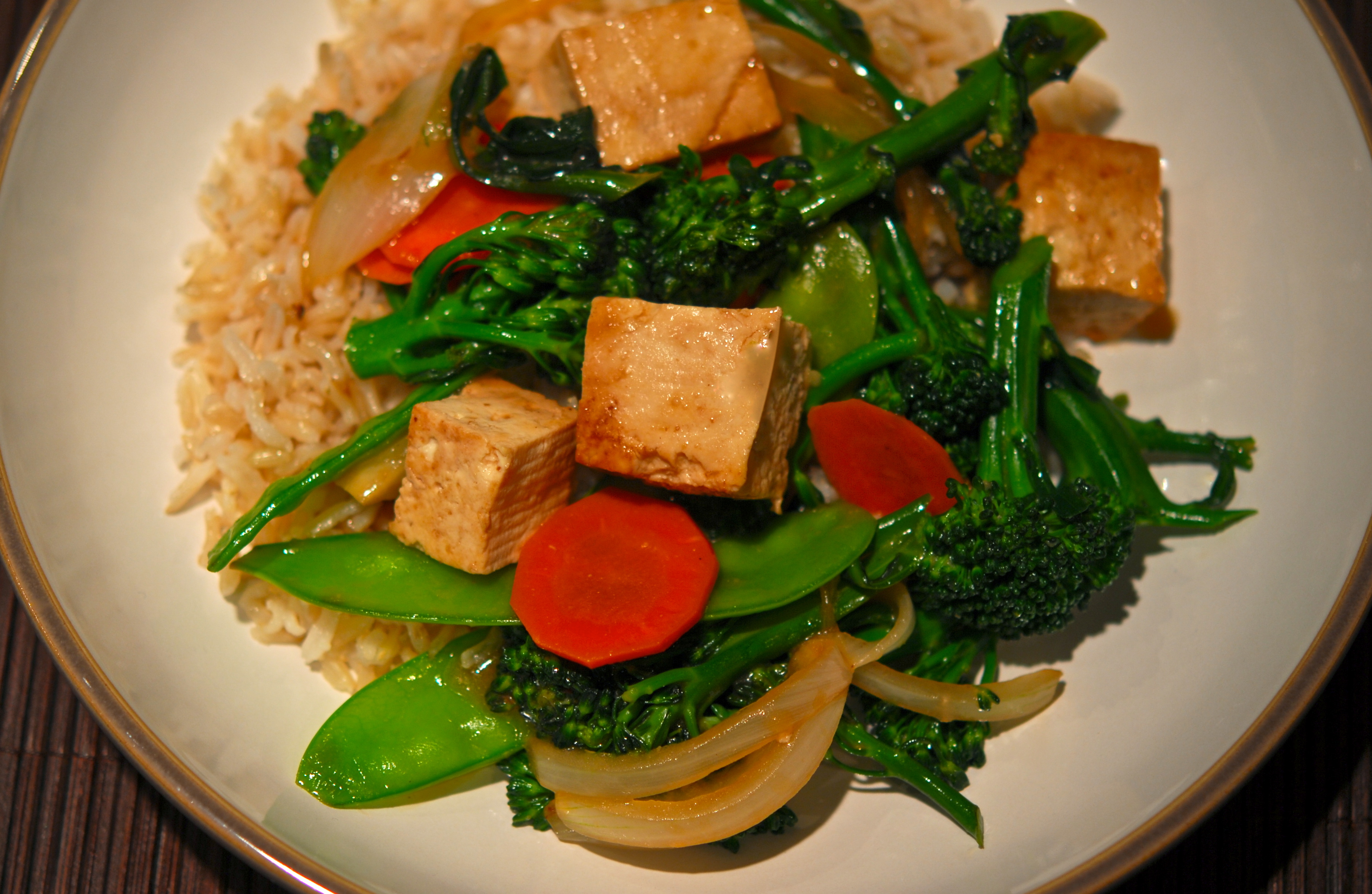 In a small bowl, combine the cornstarch and stock; set aside. Drain vegetables from the ice water bath; set aside. In a wok or open saute pan, heat the canola oil over high heat. Sauté onion and garlic for 2 minutes, stirring continuously. Add vegetables; stir fry for 1 minute. Reduce heat to medium high and add the stock cornstarch mixture and reserved marinade. Cook for 3 minutes, stirring frequently. The sauce will thicken. Taste and add salt or soy sauce if needed. If you’d like a little heat, add a pinch of crushed red peppers flakes. Serve over hot rice.