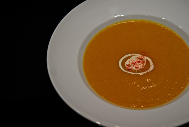 Oh. My. Gosh. You have to try this soup. We had family visiting the past several days and last night went out for dinner to a local neighborhood restaurant, Crow. This was their soup du jour. I scarfed it down then promptly announced, “More soup, please.” And if I could have cancelled my entree order quick enough, I would have totally had another bowl {or two} and been happy happy! The chef was kind enough to share his recipe, which I adapted to make it totally meatless swapping the chicken stock for vegetable stock, added cumin seeds and some sugar because after the soup was complete it was missing the wonderful sweetness of the restaurant version. It is so yummy. I kid you not.