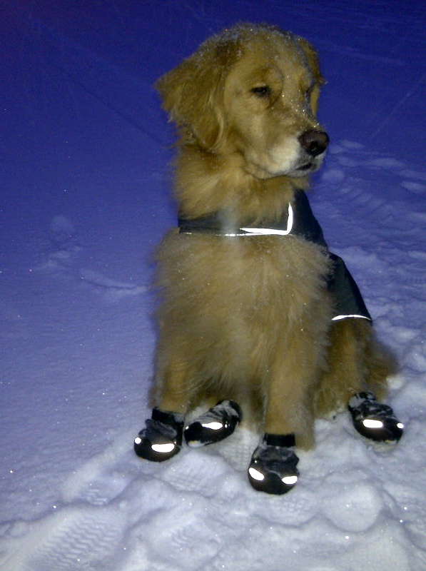 out at 7:30 a.m. for a walk. Not only did they protect his paws, he didn’t get the usual huge balls of snow on