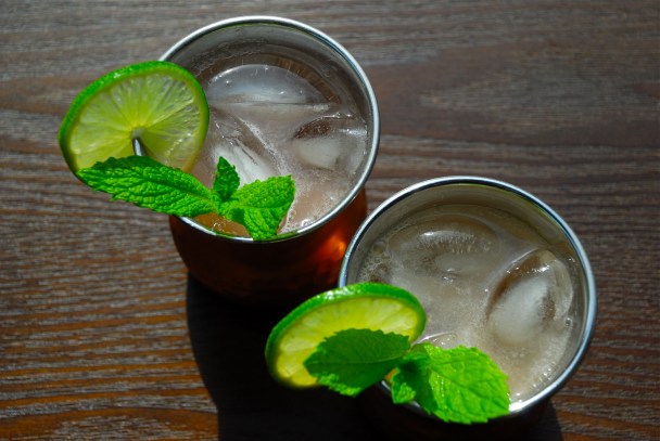 1 oz. vodka, the juice of half a lime, ¾ cup of ginger beer {my favorite is Rachel’s Ginger Beer handcrafted in Seattle} and a splash of pomegranate juice. Stir. Garnish with a lime slice and sprig of mint.