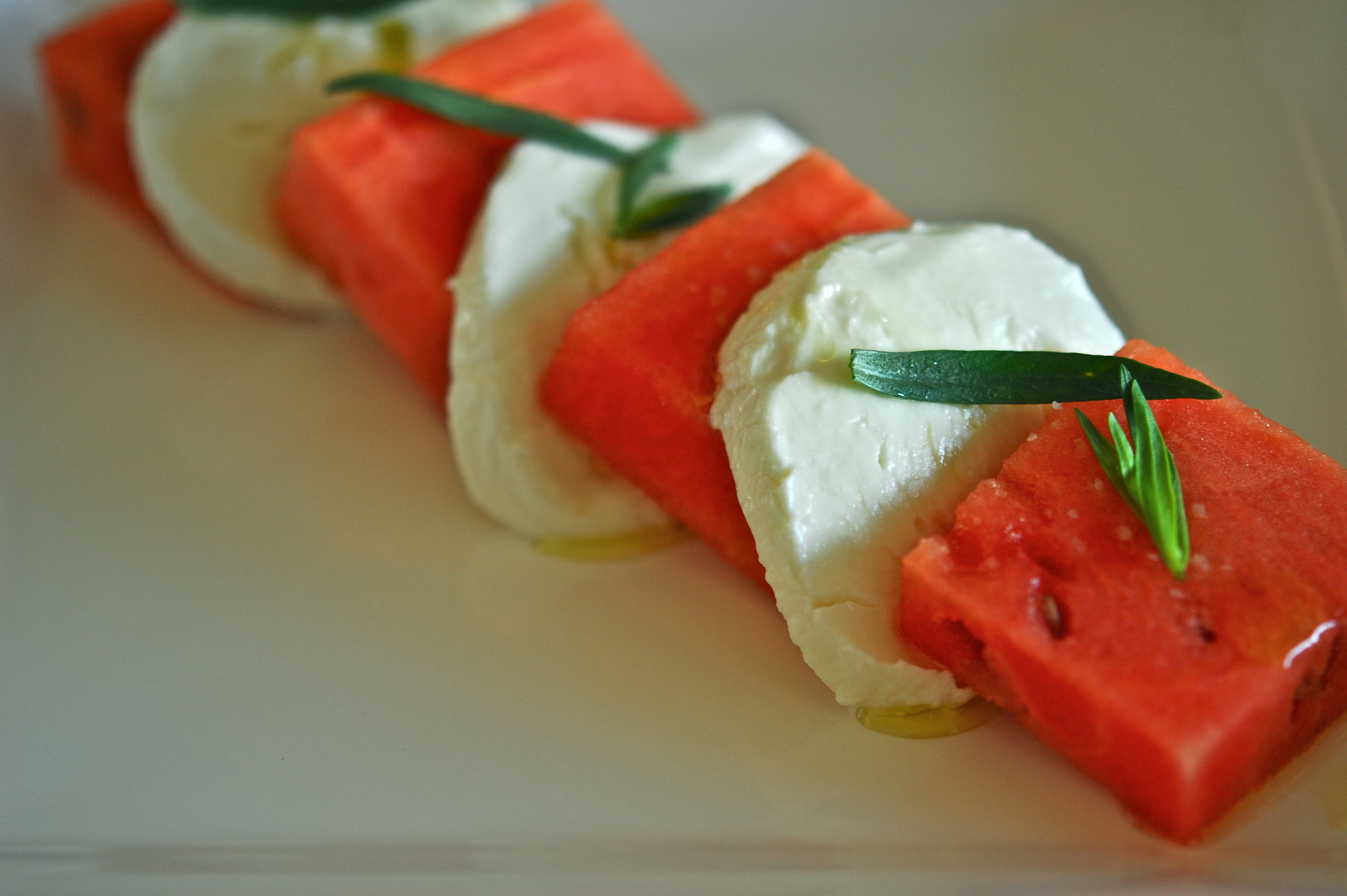 To adapt this for a party you’ll need 1 pint of ciliegine/bocconcini {small, bite-size} mozzarella, about 40 balls, ½ cup of extra virgin olive oil, 1 tsp. Kosher salt, 3 tbsp. chopped tarragon, one medium seedless watermelon and 20 wooden cocktail size wooden skewers. Combine the oil, salt and tarragon in a medium bowl. Add the drained mozzarella balls; toss to coat well, cover with plastic wrap and let sit at room temperature for 45 minutes. Meanwhile, cut watermelon in half and using a melon baller, cut out 4o balls. After mozzarella is done marinating, place alternate two mozzarella balls and two watermelon balls onto each skewer. It’s as easy as that!