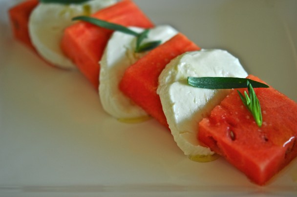 Cut watermelon into slices, ½” thick. Then cut into 2″ squares; you will want an end total of 14 squares; set aside. Cut mozzarella into 14 – ¼” slices. Using four plates, alternate watermelon and mozzarella, layering the four pieces of each on the plates. Drizzle with olive oil and sprinkle a pinch Kosher salt over each of the salads. Top with the whole tarragon leaves and serve.